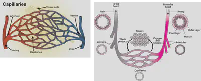 •Arteries lead into tiny blood vessels called capillaries which have very thin walls made up of very thin, flat cells so that nutrients (from food) and oxygen can leave the blood and get into cells for respiration and growth. The capillary walls keep large structures such as red blood cells inside the capillary. Other substances such as oxygen, carbon dioxide, glucose (sugar), and water can pass through.