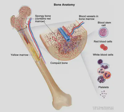 Red blood cells and white blood cells are made in the bone marrow tissue in bones.