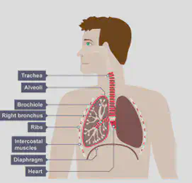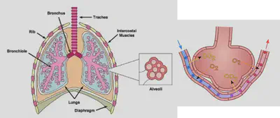 •Breathing involves muscles of the diaphragm and muscles between the ribs changing the size of the lungs.