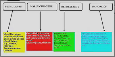 - Illegal recreational drugs – Cannabis (cause memory loss and mental illness), Ecstasy (a stimulant causing mental illness, kidney problems and even death), Cocaine (a stimulant which blocks arteries), Heroin (a depressant causing collapses veins, vomiting and severe headaches)