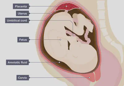 The fetus is protected by the uterus and the amniotic fluid, a liquid contained in a bag called the amnion that acts as a shock absorber.