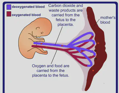 The mother’s blood does not mix with the blood of the fetus, but the placenta lets substances pass between the two blood supplies: